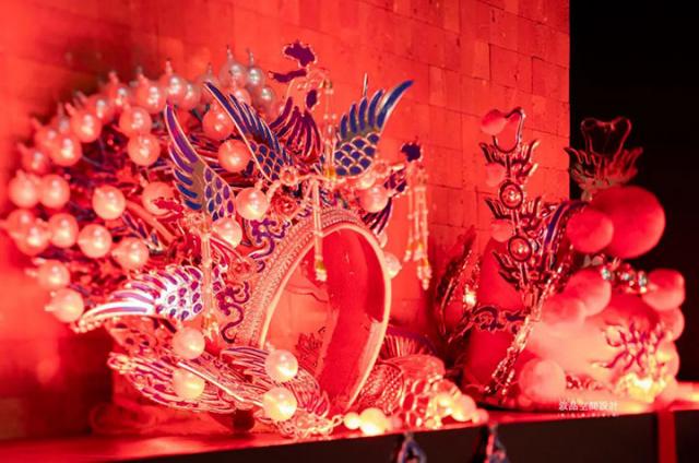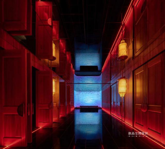 頂面繼續(xù)使用紅瓦紅磚元素,與走道形成呼應。建筑傳統(tǒng)榫卯結構在燈光變幻中彰顯恢宏氣勢。
