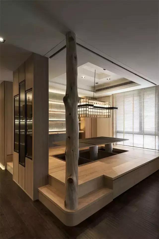 將升降臺升起,房間即刻轉換成待客廳,聊天喝茶、打牌下棋……將升降臺降下,