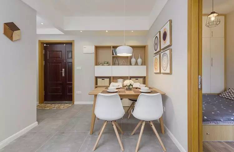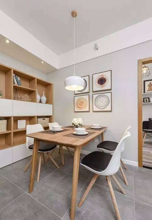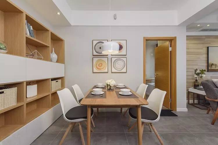 ▲ 餐邊柜是木色的格子加上白色的門板設(shè)計(jì)