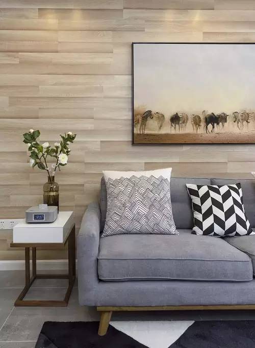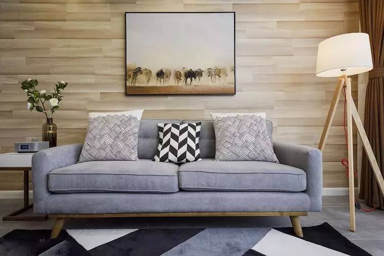 ▲ 灰色的布藝沙發(fā),邊上搭配一個(gè)三角落地?zé)?,地板上墻的背景上一幅群馬圖點(diǎn)綴