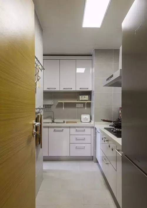 ▲ 廚房也是灰色的水泥磚,搭配白色烤漆的櫥柜門板