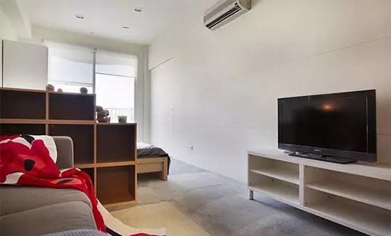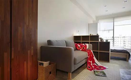 一整間的大套房,設(shè)計(jì)師以半高的柜體為墻,分割出餐廳、客廳與睡眠段落。