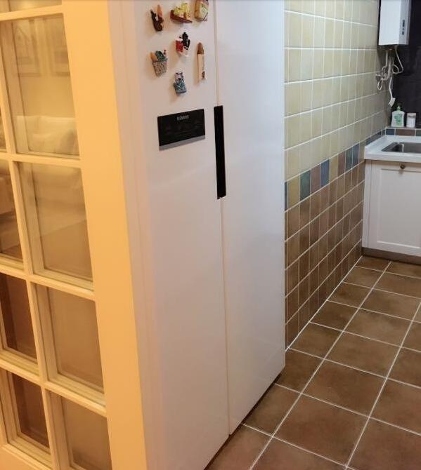 再往里走推開玻璃推拉門就是廚房了,緊湊的小廚房,五臟俱全,因為太窄做不了櫥柜還硬是把冰箱給擠進去了,不浪費分毫。