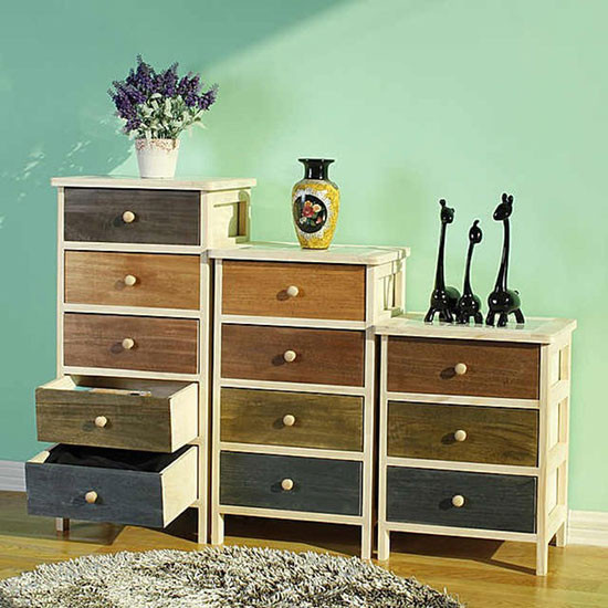 三組不同高度的斗柜組合成階梯狀,視覺上給人以流動(dòng)感和跳躍感。淺色柜體與深色抽屜的搭配更具層次感,每個(gè)抽屜雖然顏色不同,卻都能清晰地分辨出木紋。