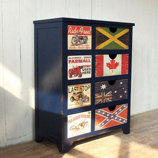 用老廣告和國(guó)旗圖案作為斗柜噴繪顯得個(gè)性十足,無論是鐘情于美式、英倫還是復(fù)古風(fēng)格,它都是你的不二選擇。