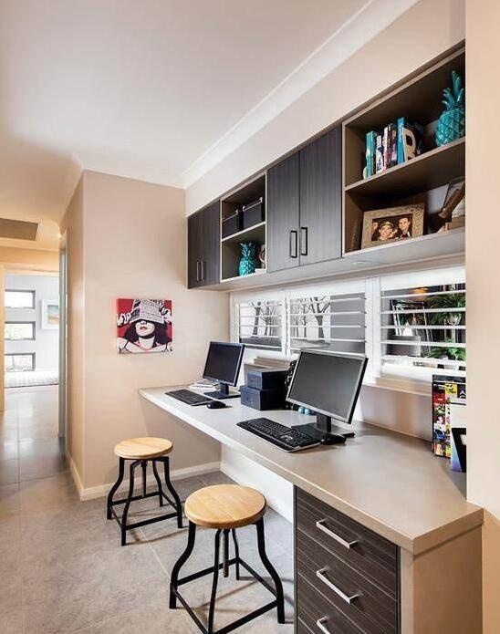 對于一些家庭,當(dāng)他們需要兩個(gè)人同時(shí)在家辦公或者學(xué)習(xí),需要用到寫字臺,這在建材市場很難找到合適的。我們就可以選擇定制一款同時(shí)需要兩個(gè)人的用的。小編推薦大家一種做法哦!沿著窗子的墻面(窗子光線更為明亮),做一個(gè)六十公分左右寬、兩米多長的條形寫字臺。