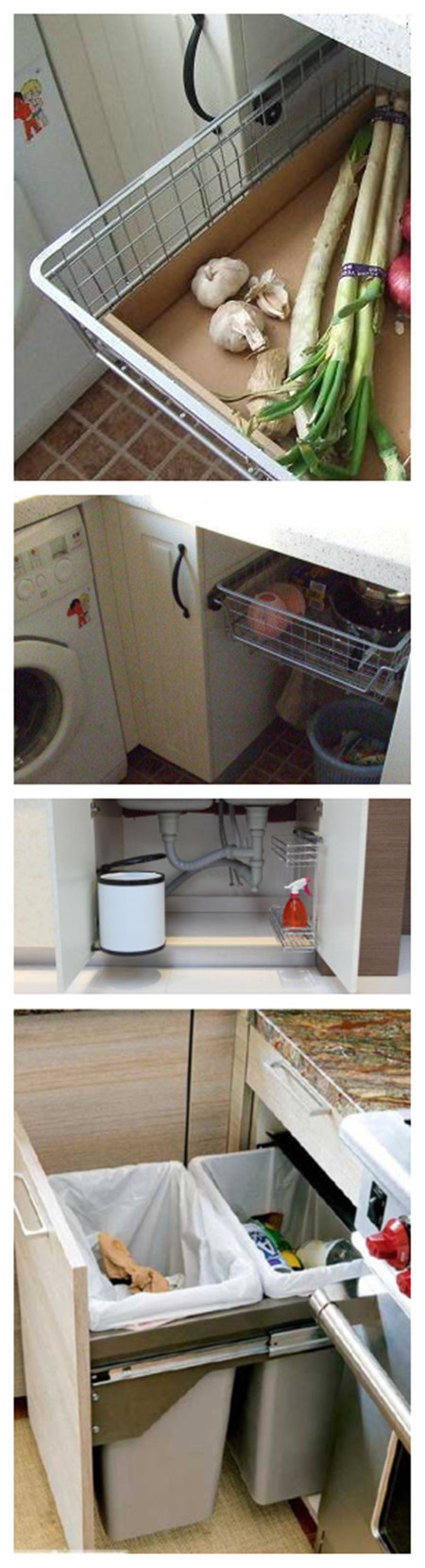 廚房的蔥姜蒜總是不知道放哪兒才好,把廚房弄得很臟,所以要有一個專門的地方放置才好;另外一個是將廚房的垃圾桶隱藏最好。