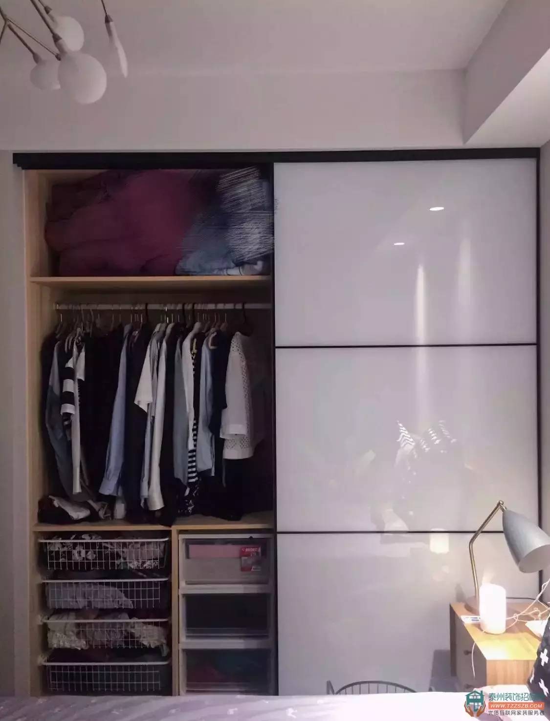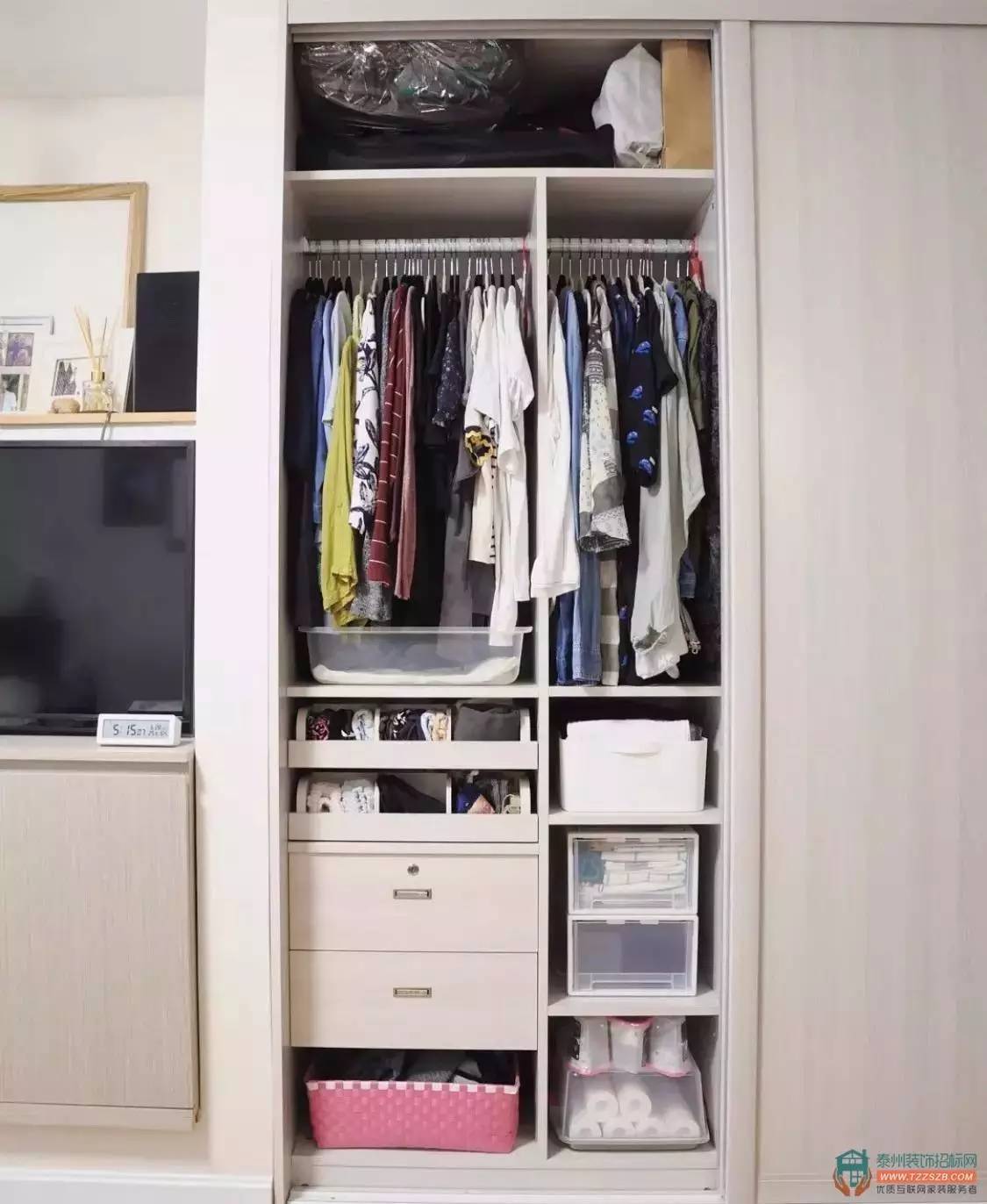 通過各種收納籃的規(guī)劃分類,原本大大的衣柜被分割成一小塊一小塊的,衣服就可以折疊好分類存放,不僅省空間,還方便查找;