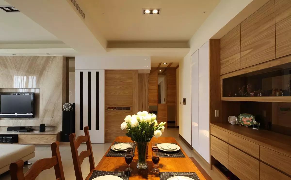 設(shè)計(jì)師以鋼琴烤漆推拉摺門隱藏規(guī)劃在餐廳左側(cè),而餐廳右方則是收納柜體,當(dāng)門片收起時(shí),木作展示柜與對稱鋼琴烤漆門片形塑完整立面。