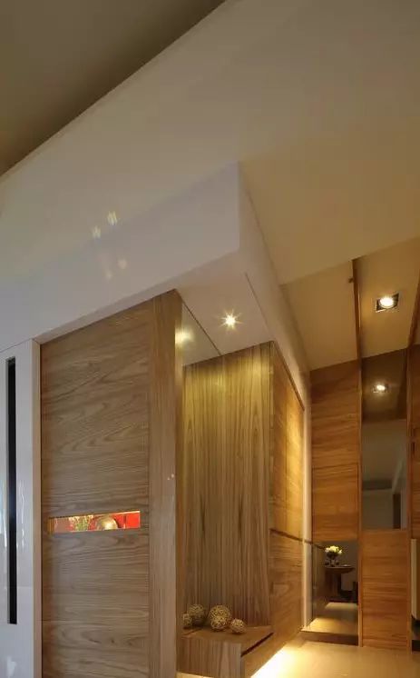 設(shè)計(jì)師亦利用屋高在玄關(guān)木作鞋柜上方延伸客廳的鋼琴烤漆材質(zhì)規(guī)劃收納柜。
