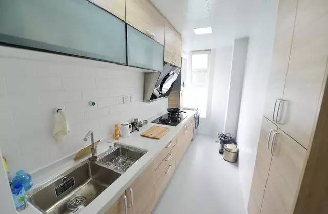 ▲廚房比較長,選擇的是雙盆的洗菜盆。在最邊緣,放上了滾筒洗衣機(jī),嘻嘻,這樣連洗衣服的大問題都解決啦!