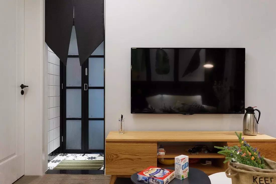 ▲淺灰色的電視墻配上橡木的電視柜,不需要過度的修飾。