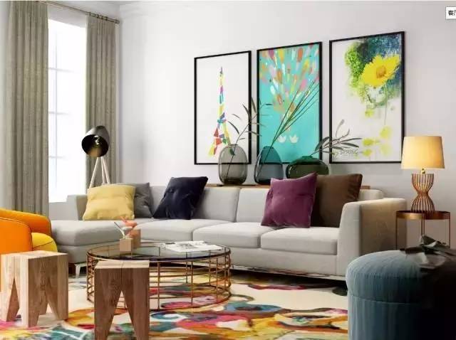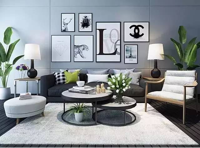 墻上的掛畫和整個(gè)客廳的色調(diào)一樣,黑白灰三種顏色,最經(jīng)典的搭配。