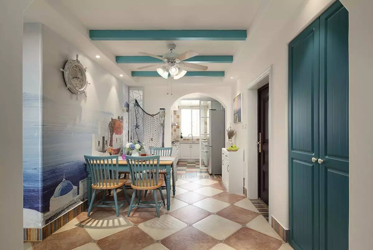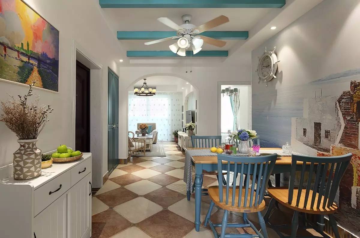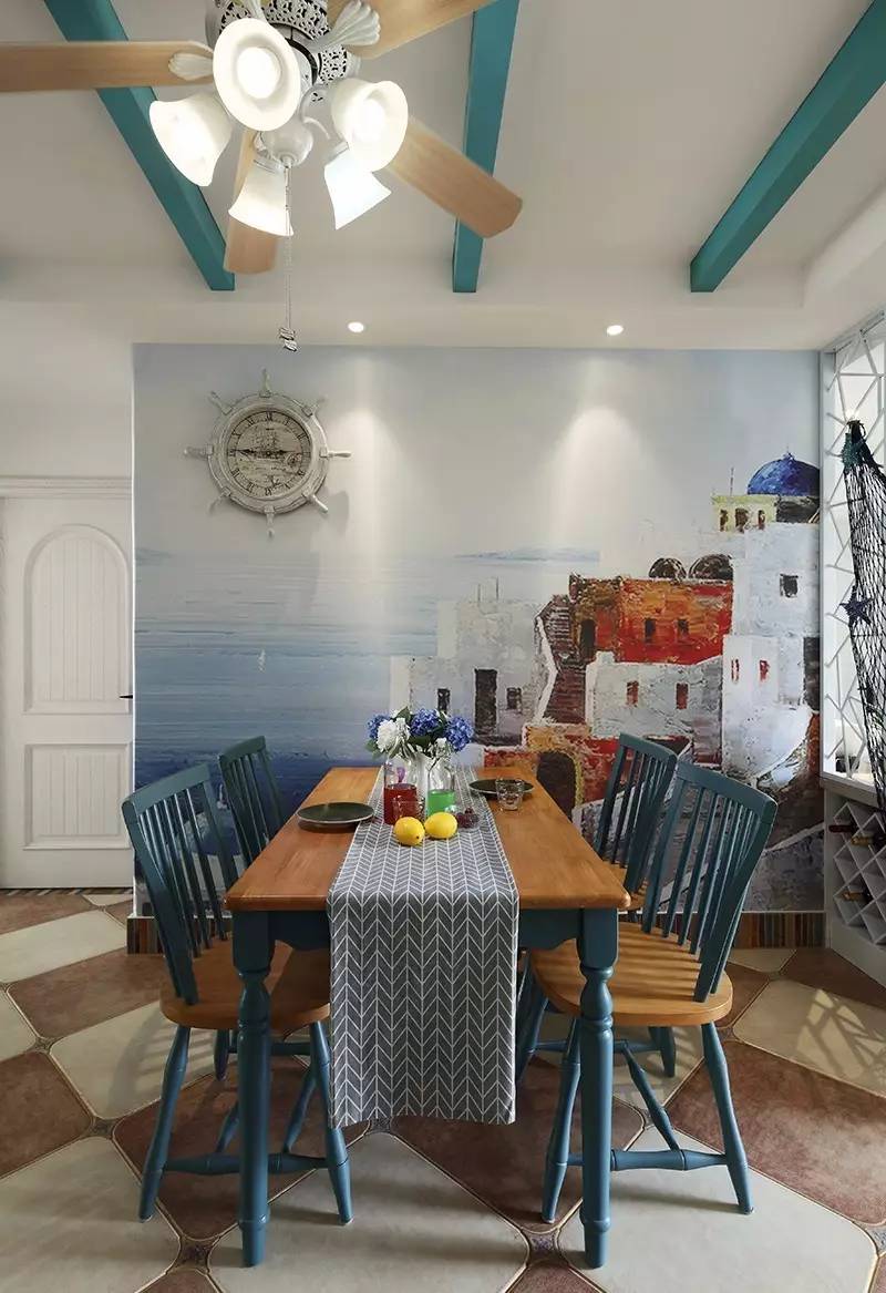 ▲客廳不管是吊頂還是墻面,多多少少都添加了一些海洋元素,在這樣的餐桌吃飯,仿佛在海灘度假哦。