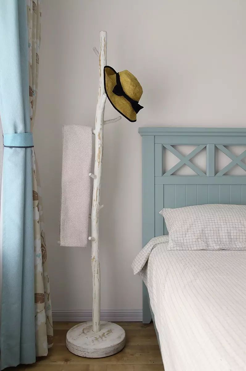 ▲ 淡藍(lán)色的家裝可以讓房屋面積看起來更大。在電視背景墻的裝飾上用了簡單的藍(lán)白豎條紋清爽十足。