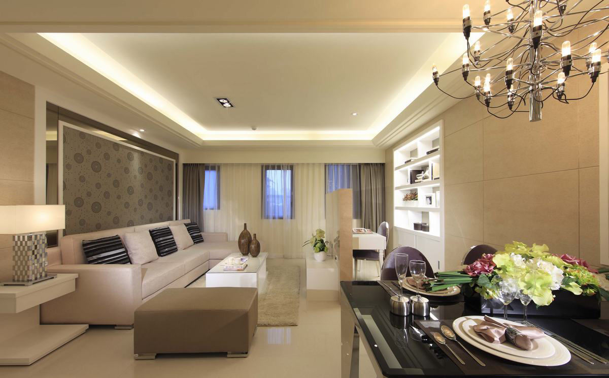 ▲客廳空間采用常見的回字形吊頂設(shè)計,形成開放式格局,營造視覺穿透感,增加客廳寬敞氣勢。
