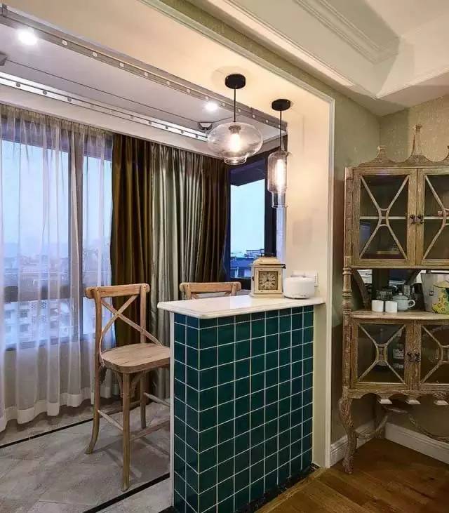 陽臺封起來后,在客廳與陽臺的接合處,設(shè)計隔斷吧臺,是一個提升整體家居格調(diào)的方法。