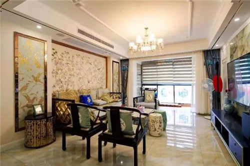 沙發(fā)墻則以中式儒雅的清新圖案,結合太師椅與鼓凳,充滿了中式的禪意韻味。