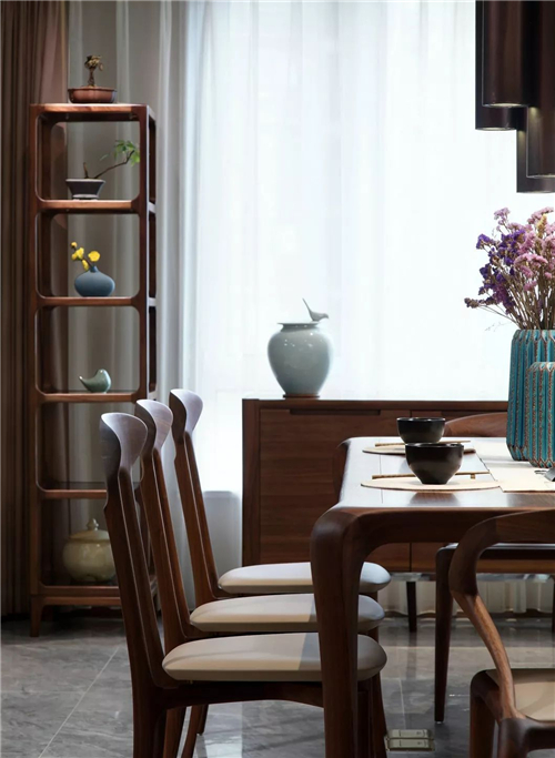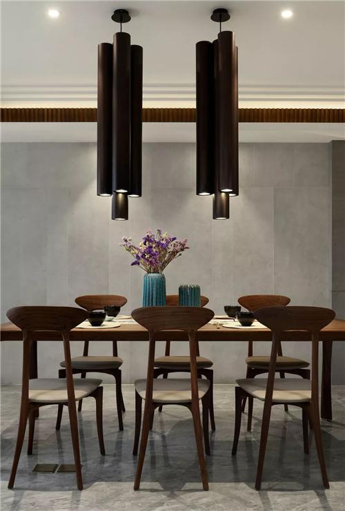 在整個(gè)空間中,設(shè)計(jì)師用溫暖而有溫度的木質(zhì)和冷灰調(diào)的石材有機(jī)結(jié)合,達(dá)到視覺(jué)色調(diào)上的一種平衡。而當(dāng)晚上回到家打開(kāi)燈,暖色的燈光帶映襯著木質(zhì)的造型,一種溫暖而慵懶的舒適蔓延在空間中,讓人充分感到家的放松。在家私選擇上,精心挑選的布藝沙發(fā),皮質(zhì)靠背床和餐椅,搭配著胡桃木邊框,舒適而又有東方意味。