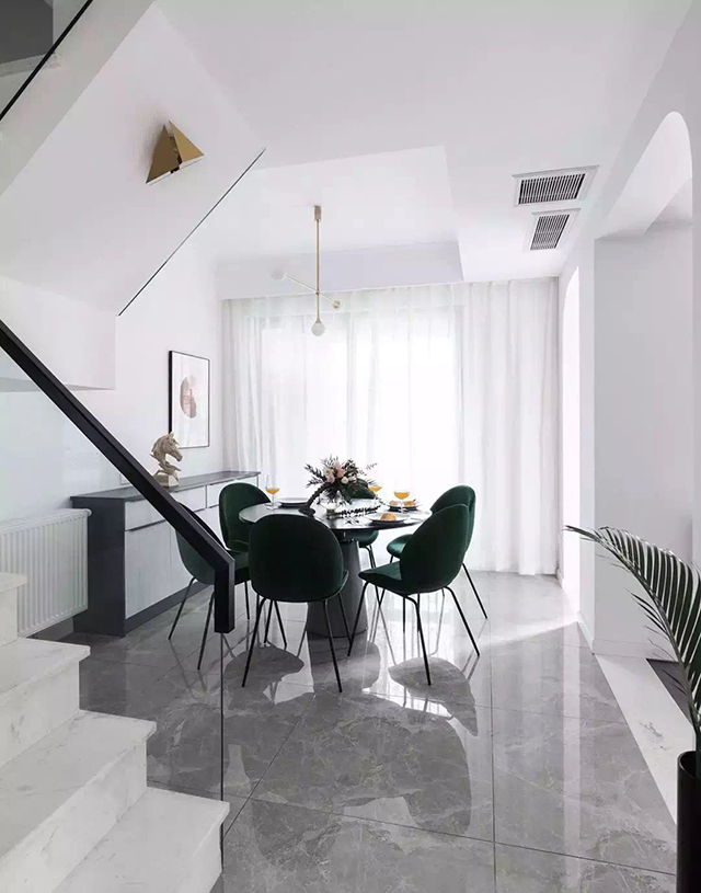 三棱錐形的壁燈,祖母綠的甲殼蟲餐椅搭配立柱黑色圓桌,有種高貴的感覺。餐廳雖然在樓梯底部,但絲毫也不影響采光。