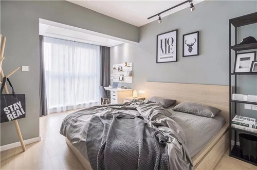 ▲主臥以灰色墻面基礎(chǔ),搭配灰色床單,在木色床與床頭柜的搭配下,顯得簡(jiǎn)約又自然。