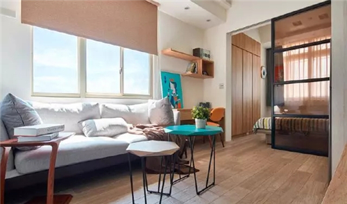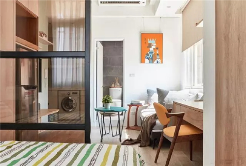入門就能一眼望見屋內(nèi)的所有物品,也說(shuō)明一點(diǎn),沒(méi)有隔斷,屋內(nèi)開闊??蛷d與臥室各有一個(gè)大窗戶,這樣讓整個(gè)房間采光效果極好。當(dāng)然為了讓整個(gè)房間看上去不至于局促,臥室應(yīng)用了透明玻璃門。