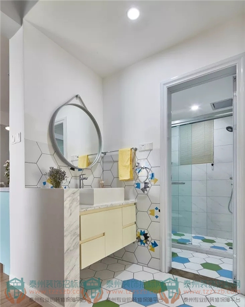 衛(wèi)浴采用了洗手臺外置的設計手法,不僅巧妙劃分了功能區(qū),也給過道空間帶來了充足的光線。六邊形小彩磚與原木地板將兩個衛(wèi)浴與過道空間清晰劃分,更便于日常打理。
