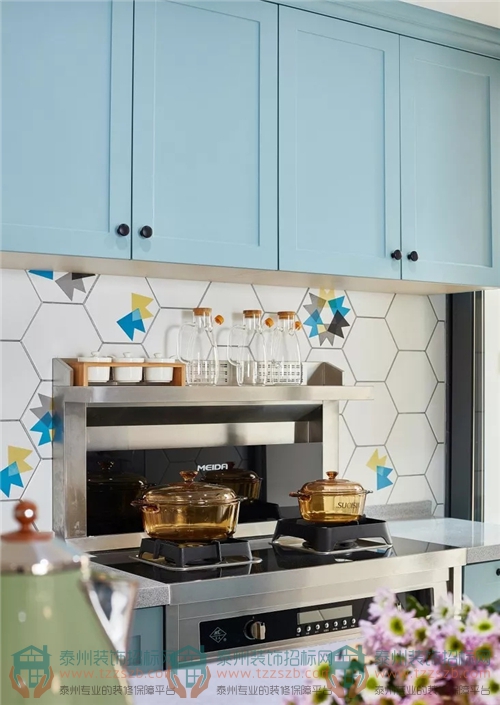 天藍色的運用,讓收納柜頗多的小廚房完全不顯壓抑,明亮且通透。整個廚房既開放也有半隔斷之感,設計師在色系、材料的把控上避重就輕,為小廚房營造出一種“屋外冬日、屋內夏日”的清新感。