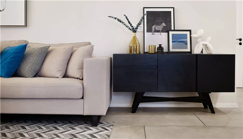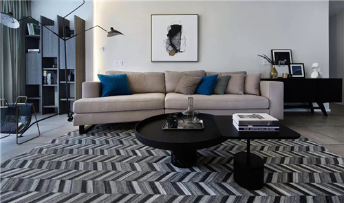 客廳,采用淺色背景墻下融入深色家具,家中再排放一些小裝飾,增加現代精致感。