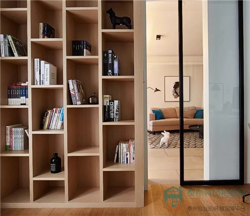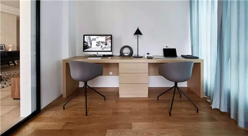 書房,是一個可以安靜學習的獨立休閑的空間,長長的書桌,可以同時供兩個人使用,書架也特別簡約時尚。