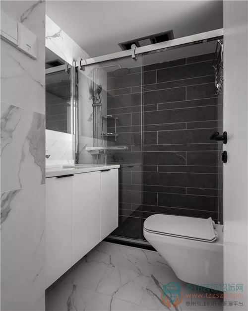 主衛(wèi)的是暗衛(wèi),為了保證主臥的收納和主衛(wèi)的采光,在整組收納柜體的中間做了部分霧玻來增加衛(wèi)生間的采光度,同時也保證屋主不希望臥室能看到衛(wèi)生間的一切的尷尬場面。