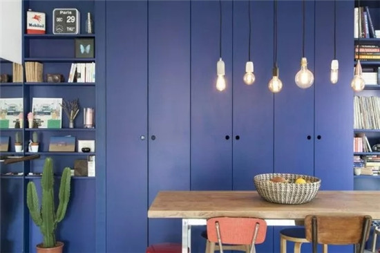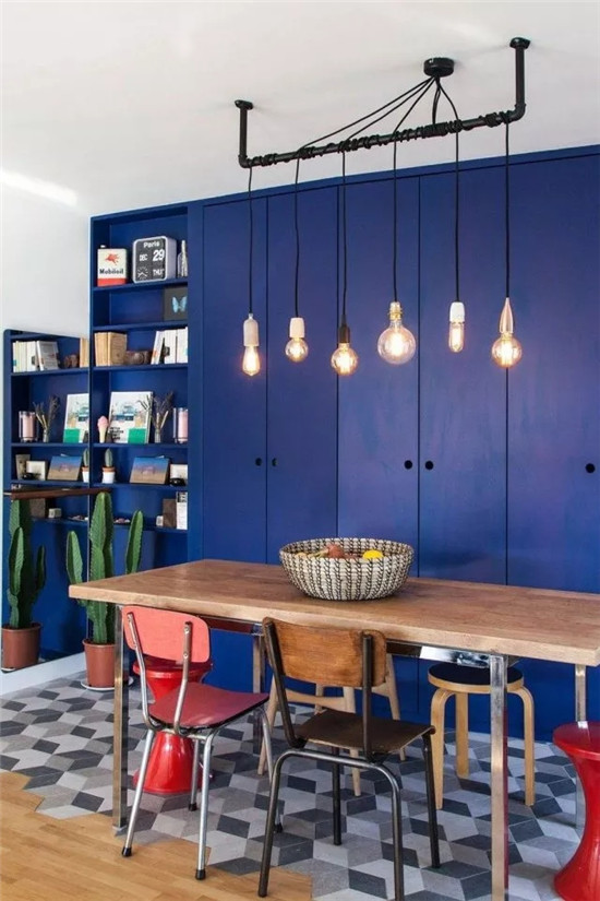 室內(nèi)餐區(qū)及廚區(qū)利用六角磚與地板銜接,既便于打掃,又為室內(nèi)帶來不同的趣味。同時,一側(cè)的系統(tǒng)柜被涂刷成藍(lán)紫色,提供了充足的收納及展示功能。