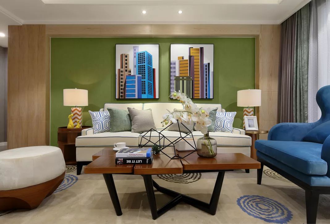 ▲草綠色的沙發(fā)墻上,掛上兩張城市建筑風(fēng)格的裝飾畫,茶幾上擺著一個(gè)幾何邊框的裝飾品,讓這個(gè)客廳顯得現(xiàn)代輕松而又時(shí)尚的感覺。