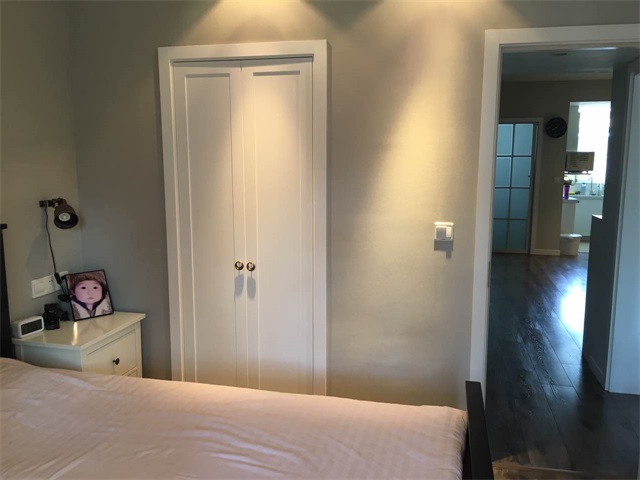 主臥墻體以灰白色為主調(diào),格調(diào)雅致簡單,最驚喜的就是專門為主臥設計了一個內(nèi)嵌隱形的更衣室,既增加美觀又方便收納,夫妻兩特別喜歡。