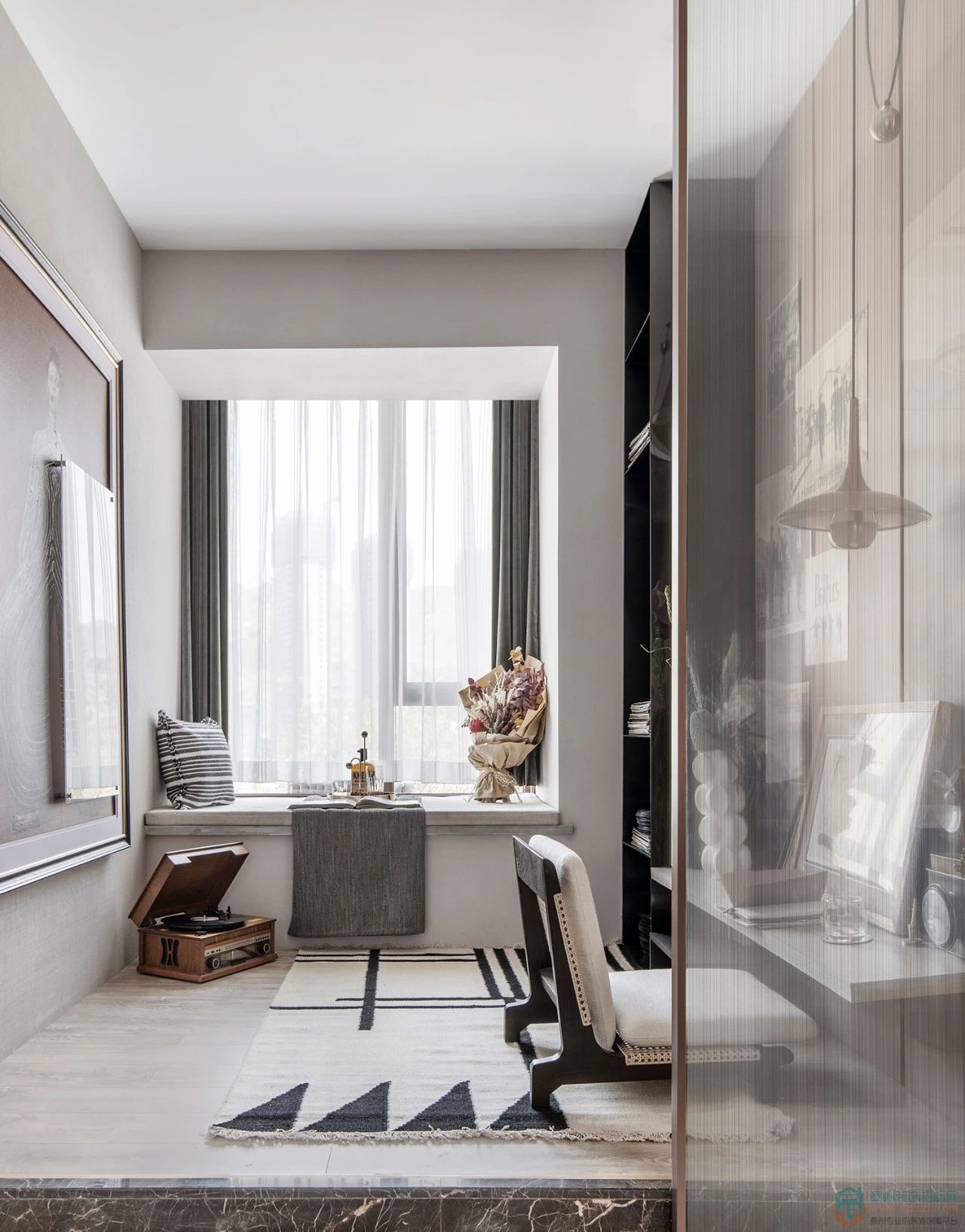 世界上的藝術(shù)具有相通性。音樂、書籍、品酒,形式縱有不同,也是對(duì)趣味和審美的精神向往。美好的時(shí)尚、美好的品質(zhì)生活,都應(yīng)如此。復(fù)古的金色飾品和燈具,傳遞出輕奢的氣質(zhì)。黑白色的窗臺(tái)書柜座椅,幾何形狀的地毯,現(xiàn)代摩登風(fēng)情撲面而來(lái)。