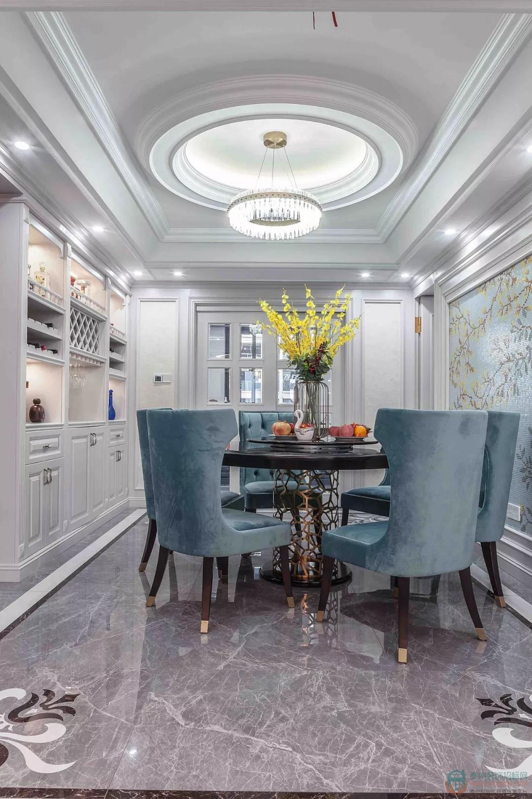 色彩上展現(xiàn)出古典美與現(xiàn)代生活文化結(jié)合,以金屬、米色為基調(diào),雅致的霧霾藍(lán)、米黃色作為點(diǎn)綴,使整個(gè)空間更具尊貴感。配合硬裝硬朗的材質(zhì)和明快的色調(diào),軟裝點(diǎn)綴雅致的配飾,賦予空間沉穩(wěn)、典雅的神韻。