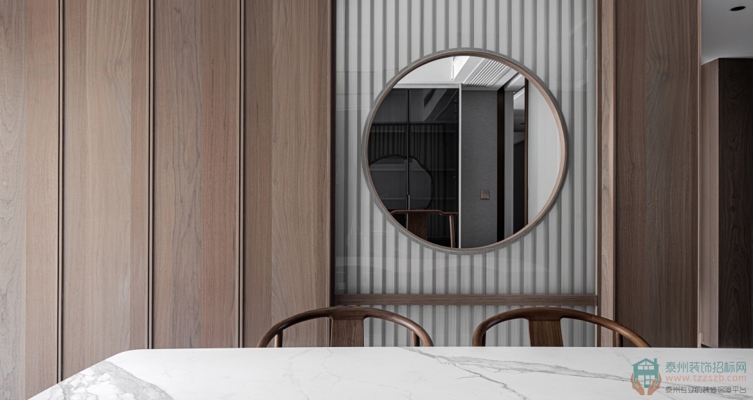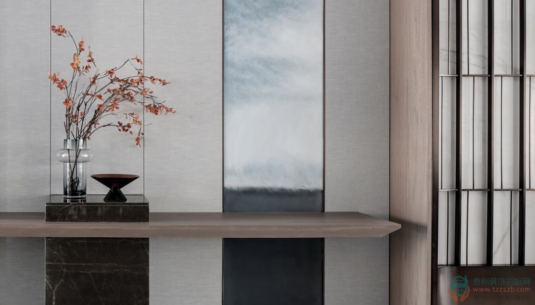 步入屋內(nèi),大理石與胡桃木定制造型的端景臺與冷調(diào)定制墻畫相互襯映,柔與剛、動與靜之間賦予空間靈動的生命力,提煉寧靜與安逸的環(huán)境和諧之美。