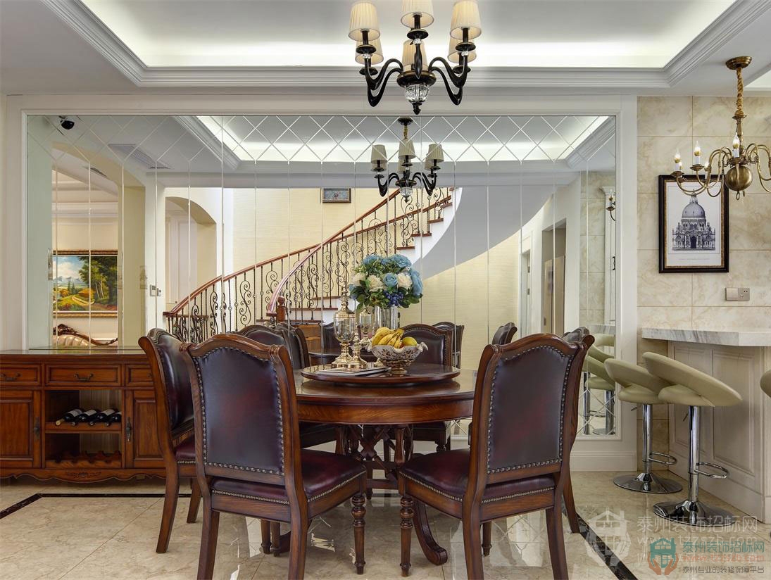 門廳與客廳用鐵藝做鏤空隔斷。讓客廳的光透過來,使整個空間更加通透,增加整體感。餐廳及廚房做一個抬高,使空間富有層次感。