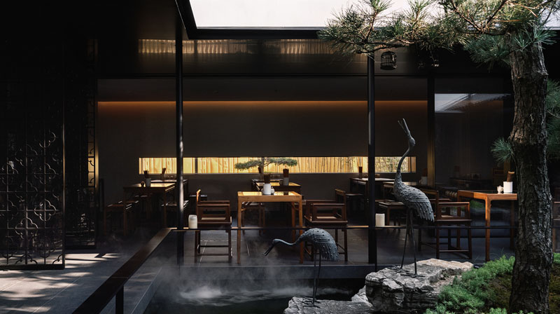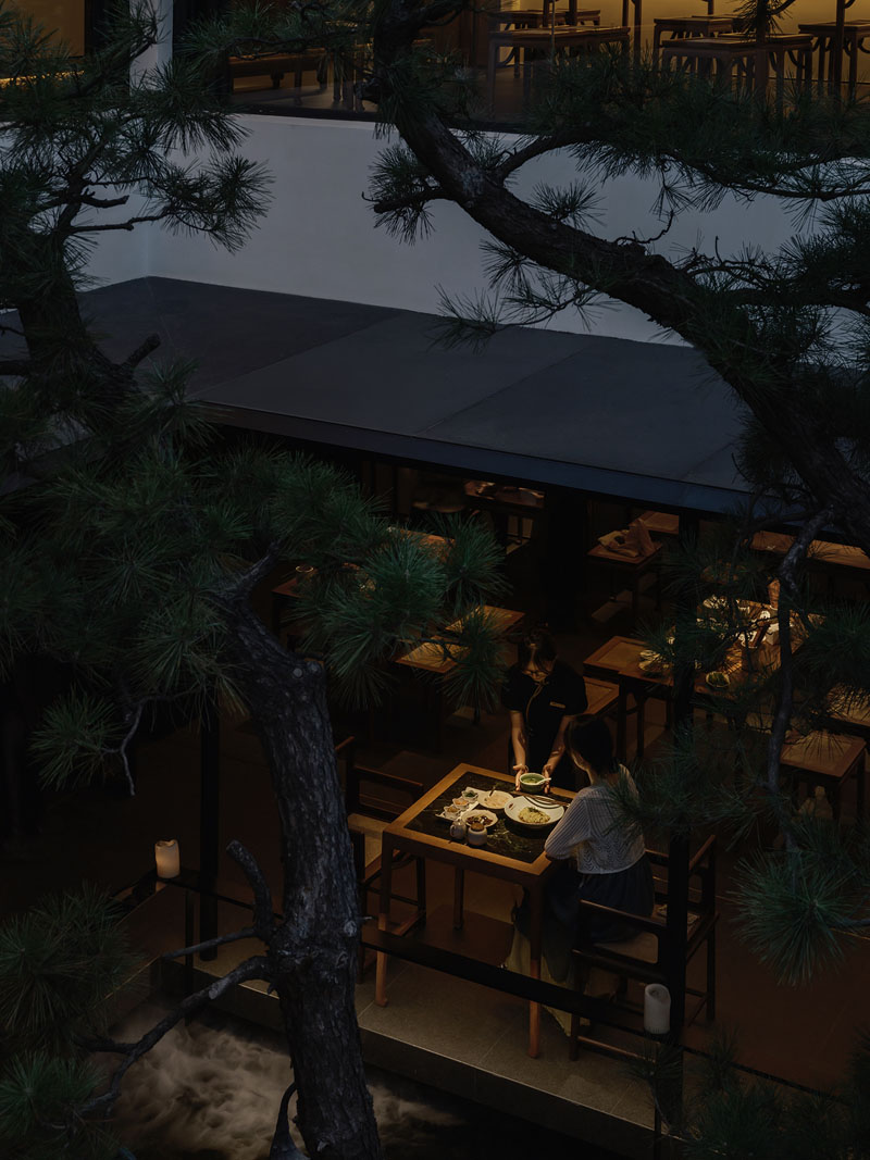 設(shè)計(jì)師提煉了中國傳統(tǒng)老宅工藝的建筑風(fēng)格,以松迎客,以木為質(zhì),細(xì)膩描摹,將中國傳統(tǒng)文化意象演繹得精細(xì)獨(dú)到、恰至佳境。同時(shí)輔以現(xiàn)代手法表現(xiàn),又隱隱透出年代感的影子,打造兼具藝術(shù)感官、互動交流、自然體驗(yàn)的多元空間,引領(lǐng)食客浸潤其中。